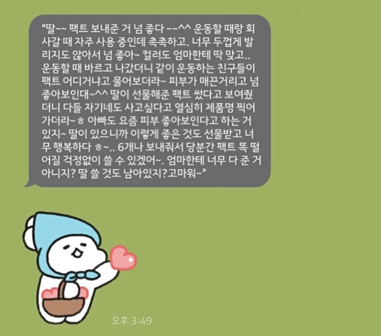 “딸~~ 팩트 보내준 거 넘 좋다 ~~^^ 운동할 때랑 회사갈 때 자주 사용 중인데 촉촉하고. 너무 두껍게 발리지도 않아서 넘 좋아~ 컬러도 엄마한테 딱 맞고.. 운동할 때 바르고 나갔더니 같이 운동하는 친구들이 팩트 어디거냐고 물어보더라~ 피부가 매끈거리고 넘 좋아보인대~^^ 딸이 선물해준 팩트 썼다고 보여줬더니 다들 자기네도 사고싶다고 열심히 제품명 찍어가더라~ㅎ 아빠도 요즘 피부 좋아보인다고 하는 거 있지~ 딸이 있으니까 이렇게 좋은 것도 선물받고 너무 행복하다 ㅎ~.. 6개나 보내줘서 당분간 팩트 똑 떨어질 걱정없이 쓸 수 있겠어~. 엄마한테 너무 다 준 거 아니지? 딸 쓸 것도 남아있지?고마워~”